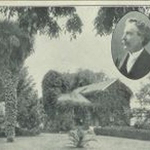 Postcard--black and white: Home of Burbank-Santa Rosa with oval insert of Luther Burbank picture in upper right corner. Typed in right hand column: "Home of Luther Burbank, The Wizard of Horticulture, Santa Rosa, California. Published by Hall Art and Novelty Store 314 B Street Santa Rosa, Cal."