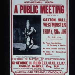 British Empire Union with which is incorporated the Anti-German Union. A public meeting will be held at Caxton Hall ... No peace negotiations till Germany is beaten, no more German influence, no votes for concientious [sic] objectors