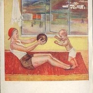 A poster showing a woman holding a ball and playing with a child. No text. [Description English/roman)]