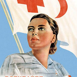 Soviet poster. Caption reads, "Вступайте в ряды обществ Красного Креста и Красного Полумесяца! / Vsupaite v riady obshchestv Krasnogo Kresta i Krasnogo Polumesiatsa!", meaning, "Join [Description English/roman)]