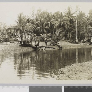 A group of Malaitan men and women stand on and around a falled tree trunk on shore of small waterway. Title transcribed from envelope. Date from biographical sources. Verso of photo reads: "Malaita The baddest isle."