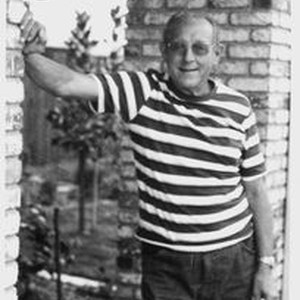 Photo--black and white: Harold Narron about 1970 standing by a brick pillar with a garden in the background. Harold was the son of Gladys Crabtree Narron Berry (1896-1973) and Jesse F. Narron and the grandson of Nancy E. Sullivan Crabtree.