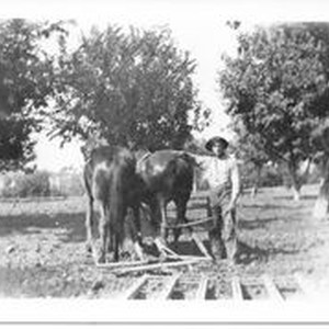 Photo--black and white: In the Perry Ranch orchard in Sebastopol circa 1910. Grandpa Perry harrowing with a homemade harrow .