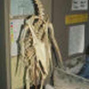 Skeleton of a penguin standing in the Oregon Institute of Marine Biology.