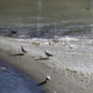 Gulls feeding on shrimp debris near the shore.