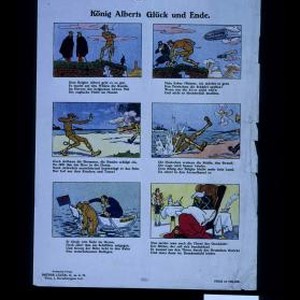 Lustige Kriegsbilder. Konig Alberts Gluck und Ende. Dem Belgier Albert geht es zu gut./ Er macht auf dem Wallen die Runde,/ Im Herzen der Belgischen Lowen Mut
