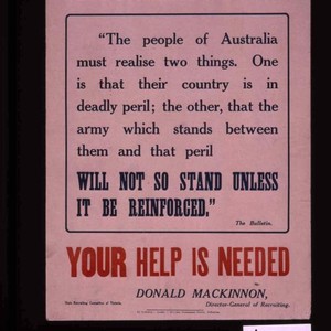 Australia's peril. "The people of Australia must realise two things. One is that their country is in deadly peril; the other, that the army which stands between them and that peril will not so stand unless it be reinforced." Your help is needed
