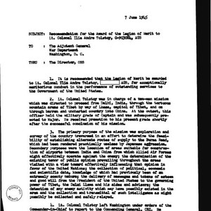 Memo to the adjutant general recommending Ilia Andre Tolstoy for Legion of Merit award