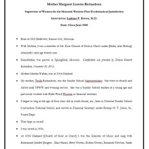 Transcript of interview of Margaret L. Richardson by Ladrian P. Brown, ca. June 2012. [Description English/roman)]