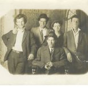 Postcard--black and white, photo: Group of five unidentified West County men. Circa 1910-1920