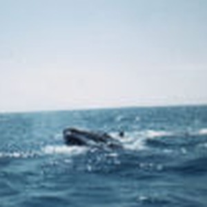 A whale calf jumping out of the water at Scammon's Lagoon with its mother swimming right behind.