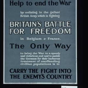 Help to end the war by enlisting in the gallant british Army, which is fighting Britain's battle for freedom in Belgium and France. The only way to bring the war to a speedy and victorious end and to punish the Germans for their barbarous treatment of unoffending civilian populations is to carry the fight into the enemy's country