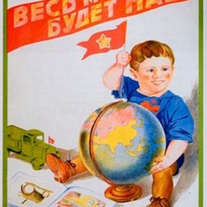A poster. Caption reads, "Ves' mir budet nash! / Весь мир будет наш!", meaning, "The whole world will be ours!" [Description English/roman)]