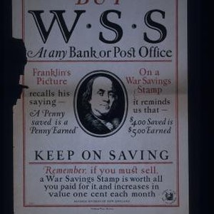 But W.S.S. at any bank or post office. Franklin's picture on a War Savings Stamp recalls his saying "A penny saved is a penny earned" ; it reminds us that $4.00 saved is $5.00 earned. Keep on saving. Remember, if you must sell, a War Savings Stamp is worth all you paid for it, and increases in value one cent each month