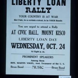 Liberty Loan Rally. Your country is at war. Her fate, to a certain extent, is in your hands. You are urged to attend a rally at Civic Hall, Mount Kisco Liberty Loan Day, Wednesday, Oct. 24 ... music, brass band