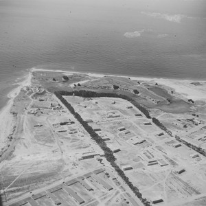 An aerial view of the campus from the early 1950s, looking towards the ocean in a southwesterly direction. The first two University buildings constructed are seen in the middle-lower-right (the Carjola-designed library) and immediately to the left of the eucalyptus windrow (the Soule and Murphy designed Science Building, now Webb Hall). This image clearly shows the large number of Marine Base buildings that were utilized by the University. The row of one-story building on the lower left corner of the photograph were the men's dormitories, the "Old Gym" is along the lower right side of the image, and the sweeping half-circle of two-story buildings which were used as offices and classrooms.