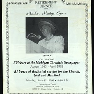 Retirement dinner program, Madge Cyars, University of Detroit, Detroit, Michigan, 1992 June 22. Two copies of pages 1-2. Also included is an article: Stephen Briscoe. "Mother Cyars: she retires after 39 years at Chronicle, but remains busy on church and civic front" in Mighican chronicle (1992 April 1). [Description English/roman)]