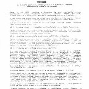 Minutes from the meeting of the pastors and workers of the Pentecostal Church in Croatia that was held on May 21, 1992 in Zagreb. [Description English/roman)] Zapisnik sa sastanka sabora propovjednika i djelatnika Evanđeoske crkve u Hrvatskoj koji se održao 21. svibnja 1992. godine u Zagrebu. [Description (original non-English/roman language/script)]