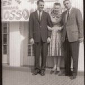 Theresa Wetch, Leo Nomellini and and unidentified man standing in front of the original Chamber of Commerce building at Santa Rosa (Sebastopol) Avenue and Petaluma Avenue