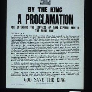By the King. A proclamation for extending the services of time-expired men in the Royal Navy ... We, by and with the advice aforesaid, do hereby order and direct that all classes of men now serving in our Navy whose term of service may have expired, or may expire while this proclamation shall continue in force, shall be required to serve for a period of five years from the expiration of their respective terms of service ... God save the King