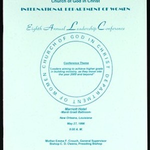 Leadership conference, International Women's Department, Church of God in Christ (8th: 1996), "Leaders aiming to achieve higher goals in building ministray, as they move into the year 2000 and beyond", program, Marriott Hotel, New Orleans, Louisiana, 1996 May 27. [Description English/roman)]