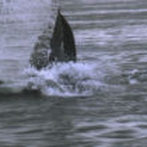 A trio of whales swimming in Scammon's Lagoon. One whale is splashing its flippers.