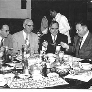 Congressmen Hubert B. Scudder, James Utt, Joe Martin and Joe Holt enjoying Hallberg (Redwood Empire brand) apple sauce and apple butter at the Capitol restaurant in Washington DC, 1954