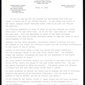 Emma f. Barron, Odessa newman, Ela Moore (Church of God in Christ. Texas northeast jurisdiction. Women's Department), 2200 South Marsallis, Dallas, Texas & 5800 Bonnell Street, Fort Worth, Texas, circular letter, 1991 March 3. [Description English/roman)]