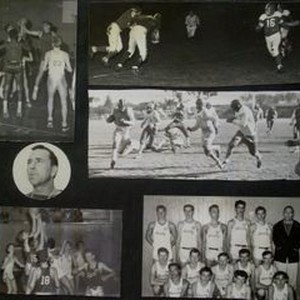 Photo--Black and white: Analy High School sports--football 1952 and basketball 1953. Various photos. Round photo is head coach Walt Foster. Bottom right photo--team picture of 1953 Analy B Basketball. Front row--L-R: Garloff, Ernie (20) Vaz, Ray (12) Abbott, Corky (10) Adair, Dan (11). Middle row: Shell, Ben (14) Ament, Don (17) Horn, Charles (23) Blank, Ed (22) Finch, Dick (16). Back row: Moore, Jerry (13) Janssen, Walt (19) Murray, Bill (21) Briggs, Steve (24) Keith, Charles (15) Foster, Walt--coach.