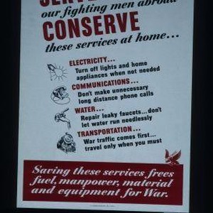 Serve our fighting men abroad. Conserve these services at home ... electricity ... communications ... water ... transportation. Saving these services frees fuel, manpower, material and equipment for war
