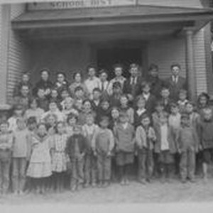 Photo--sepia: Pleasant Hill School with students and teachers on front steps of school circa 1900.