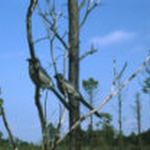 Two Florida scrub jays perched on branches.