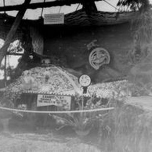 Photo--black and white, from Borba celluloid negative: Gravenstein Apple Show display by Sonoma Valley, Valley of the Moon, of the nursery rhyme "Hey diddle diddle, the cat and the fiddle."