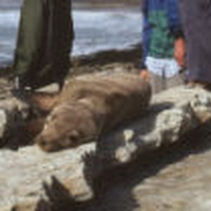 People standing around a dying sea lion pup that is resting its head on a rock in Hazard Canyon.