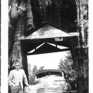 Photo--black and white: George Streckfus in Arlington, Washington, 1948, standing next to a car that is in a cut out section of a hugh tree. The sign above states "Relic of a Vanquished Forest Western Red Cedar aged1250 years Reserved at request of Snohomish Co. Pioneers A.D. Arlington, Washington 1922."