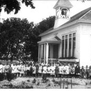 Photo--black and white: Mt.. Vernon Elementary School, original building which was built in 1903. This picture is prior to WWII, and an addition was added to school in 1921. Students and teachers stand in front of school. Mt Vernon School is now the site of the Red Barn Maple Shop in Cunningham area (Lone Pine Road) on Gravenstein Highway South.