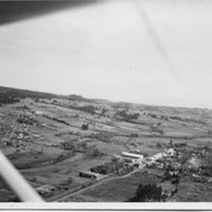 Photo--Black and white: Aerial view of Graton taken from the south looking northwest in 1950. Graton is seen at the right of the photo with the white Hallberg cannery buildings towards the center.