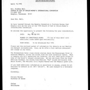 Christy Miller (Brownestone Hotel), 300 North Second Street, Memphis, Tennessee, letter, 1992 April 16, to Freddie Bell (Church of God in Christ), P.O. Box 1695, Memphis, Tennessee. [Description English/roman)]