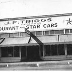 Store front of J. F. Triggs auto parts and cyclery, Dealer in Durant and Star cars, located at the southwest corner of South Main Street and Burnett Street, (200 South Main) Sebastopol, about mid-1920s