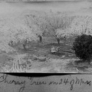 Photo--black and white: Cherry tree orchard in bloom, March 24, 1908. Two young girls are seated in the orchard and may be Blanche and Alice Riddell.