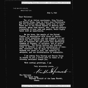 Franklin D. Roosevelt letter to the Dalai Lama