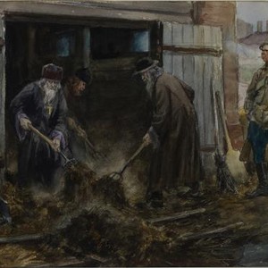 Ivan Vladimirov watercolor of priests forced to clear manure from barrack stables