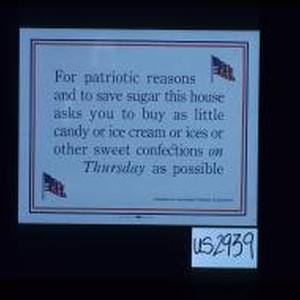 For patriotic reasons and to save sugar this house asks you to buy as little candy or ice cream or ices or other sweet confections on Thursday as possible