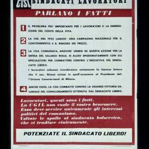 Parlano i fatti. Il problema piu important per i lavoratori e la diminuzione del costo della vita. La C.I.S.L. nel 1952 lancio una campagna nazionale per il contenimento e il ribasso dei prezzi. ... NAnche oggi, la C.G.I.L. combatte contro la grande vittoria salariale ... Lavoratori, questi sono i fatti. La C.G.I.L. non vuole il vostro benessere. Essa deve servire unicamente gli interessi politica del comunismo. Voltate le spalle al sindacato bolscevico ... Potenziate il sindacata libero!