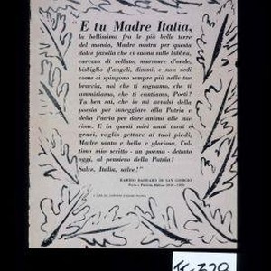 "E tu Madre Italia, ... Madre santa e bella e gloriosa, l'ultimomio scritto - un poema - dettato oggi, al pensiero della Patria! Sale, Italia, salve!" - Ramiro Barbaro di San Giorgio, poeta e patriota Maltese