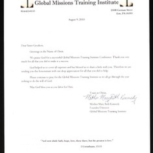 Mary Beth Kennedy (Global Missions Training Institute), 2?08 German Street, Erie, Pennsylvania 16503, letter, 2010 August 9, to Glenda Goodson. [Description English/roman)]