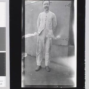 Older sailor with mustache stands on deck of the ship Mexicano. Title and date devised by cataloger. Copy print of original. Jack and Charmian London took the Mexicano from Veracruz to Tampico Mexico in May of 1914.