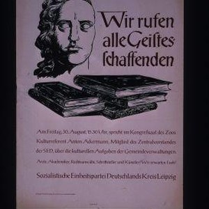 Wir rufen alle Geistesschaffenden. Am ... 30. August,.. spricht im Kongressaal des Zoos Kulturreferent Anton Ackermann,... uber die Kulturellen Aufgaben der Gemeindeverwaltungen