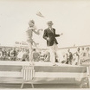 Shows two men, one in jacket, hat and cane; the other dressed as woman in shorts and tights. Stamped on verso: "20th Annual Olympic Club Track & Field Meet at San Quentin prison, c. 1920." 2012-0129. Annual event sponsored by the Olympic Club of San Francisco. Prison inmates held a field and track day. 1933 was 20th and consisted of some 29 atheletic events, stunts, chorus girls and vaudeville acts performed by prisoners. Was sponsored by Frank G. O'Kane of the Olympic Club. Some 5000 inmates attended.