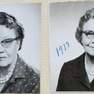 Photo, black and white: Mary Elizabeth (Bess) Barlow Hallberg (b. 11-20-1891), married to Oscar A. Hallberg owner of O. A. Hallberg & Sons. Pictures from 1959 and 1973.